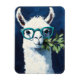 Playful twist to cute animal art and humour with a quirky white llama rocking teal glasses and holding a leafy branch.