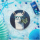 Playful twist to cute animal art and humour with a quirky white llama rocking teal glasses and holding a leafy branch.