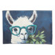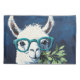Playful twist to cute animal art and humour with a quirky white llama rocking teal glasses and holding a leafy branch.