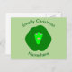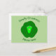 This postcard features a cute cartoon of a green brussels sprout with big eyes and a smile. It has dark green leaves around the outside and a paler green inside.