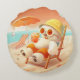Smile Dog is in full vacation mode—relaxing in orange shorts, sipping a beach drink, and soaking up the sun. Perfect for summer vibes and chill spaces.