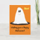 This cute little ghost is smiling at you even as it says Boo! Illustration is white ghost on orange background, standing on black disc shape for contrast. Message on front: Wishing you a Happy Halloween! Blank inside for custom message, which can be hand written or customised at checkout.