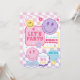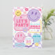 Fun pastels smiley faces invitation! A fun retro trendy theme, features pink shades, pastel blue, purple, yellow, flowers, lightning bolt, stars and chequered pattern.
