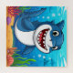 Cute artistic portrayal of a grinning blue shark in an underwater setting surrounded by vibrant coral.