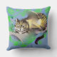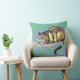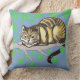 This design shows my smiling Cheshire Cat based on Tenniel's original black and white illustration, in a tree against a blue background, with green leaves. The back of the cushion shows the Cheshire Cat fading away.