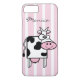 A cute girly design with a smiling cow against a wide striped background in pink and white. Ready to personalise with your name or monogram.