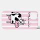 A cute girly design with a smiling cow against a wide striped background in pink and white. Ready to personalise with your name or monogram.