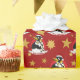 Christmas wrapping paper with an illustration of a cute smiling emperor penguin with a red Santa hat; Christmas holiday cartoon design for kids; Christmas holiday cartoon design for kids, on red background with customisable text template for your name or message; illustrated by Radka Kavalcova