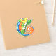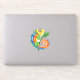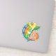 This vinyl sticker has a smiling fantasy colourful lizard in green, blue, orange and yellow with big eyes holding a twig with a green leaf.