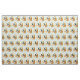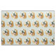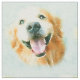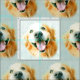 This fabric features a tiled watercolor portrait of a smiling golden retriever dog, on a blue background.