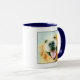 This coffee mug features a watercolor portrait of a smiling golden retriever dog, on a blue background.
