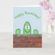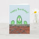 This birthday card design features a silly, happy, smiling green cactus character peeping over a brick wall. It also features the warm wish, "Happy Birthday!".