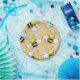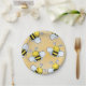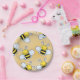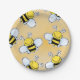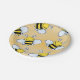 Pattern of smiling black and yellow honeybees buzzing over a pastel yellow orange colour to celebrate a birthday for children or a cute baby shower.