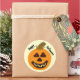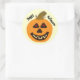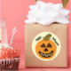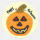 Smiling Jack-o-Lantern orange pumpkin with red eyes and stalk against pastel yellow background. Happy Halloween cool typography in black. Original Artwork by TamiraZDesigns>