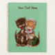 This planner is mint green with a smiling yellow lady cat wearing a white hat giving rats from her wood basket to her brown male cat friend. Customise your text on the front with the template.