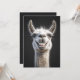 A highly detailed close-up of a smiling white llama with expressive eyes and a friendly, comical expression against a dark background.