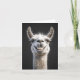 A highly detailed close-up of a smiling white llama with expressive eyes and a friendly, comical expression against a dark background.