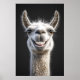 A highly detailed close-up of a smiling white llama with expressive eyes and a friendly, comical expression against a dark background.