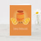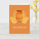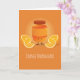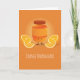 Greeting Card with a marmalade jar cartoon character. The smiling jam container is surrounded by sliced oranges. The design shows the words “Orange Marmalade” and those words can be customised.