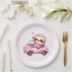 Paper plates with a whimsical illustration. A pink sloth driving around in a pink convertible. Adorable.