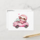 Postcard with a whimsical illustration. A pink sloth driving around in a pink convertible. Adorable.
