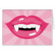 Cute pink cartoon illustration of a smiling vampire mouth with fangs on a pink background colour.