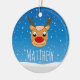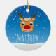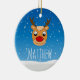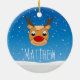 Smiling reindeer snowfall personalised blue ceramic ornament