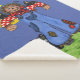 This Sherpa fleece blanket has a smiling scarecrow in blue jean overalls and a plaid shirt standing in the grass with a crow on each shoulder and a black cat at his feet with a full yellow moon behind him.