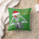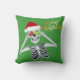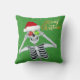 This throw pillow is green with little gold specks and a smiling skeleton holding red and green ornaments with snowflakes up to his eyes wearing a fur trimmed red Santa hat with the text Merry Christmas in bright gold on the front and back.