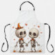 Both skeletons have large, friendly eyes and wide smiles, creating a playful and charming vibe. One skeleton is wearing an orange bow tie, while the other is dressed in both a bow tie and a cute orange witch's hat. Surrounding the skeletons are floating orange hearts, stars, and small pumpkins, adding to the whimsical and Halloween-themed atmosphere. The overall scene is cute and fun, making it perfect for a lighthearted Halloween design.