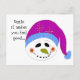 A cute snowman wearing a purple hat with snowflake accents. A big grin and a green carrot nose complete him. The saying can be changed as desired.