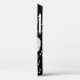This iPhone case is black with white music notes and a laughing, winking white cat with a fluffy tail walking across piano keys.