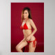 A swimsuit model poses confidently in a red bikini against a matching red background. Her expression is friendly and inviting.