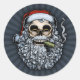Santa Claus skull with long white beard, Santa hat, round glasses, and champing a smoking cigar. Colour, pen & ink drawing on t-shirts, sweatshirts, cards & gift items.
