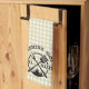 This masculine towel features a barbecue grill with a spatula and fork and says "Smoking Hot Grill Master". Background is a light tan gingham check print. There is a coordinating oven mitt, pot holder, and an apron in the shop, as well as another matching towel.