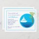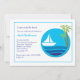 A chic boating invitation featuring a white background with a thin blue frame and a round decal with a white sailboat and palm trees. Well-suited for any nautical-theme or summer celebration. (VZ sea icon graphics by freevector). The card is easy to customise with your wording, font, font colour, paper shape options and choice of six paper types.