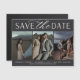 A modern save the date magnet designed to accommodate 3 vertical photos aligned side by side. "Save the date" appears across the top in chic block and script lettering, with your names, wedding date and wedding location beneath, along with your wedding website or additional details.