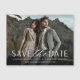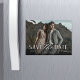 A modern save the date magnet designed to accommodate your favourite horizontal or landscape orientated full-bleed engagement photo. "Save the date" appears near the bottom of your photo in white block and script lettering, with your names, wedding date and wedding location beneath. Use the additional line of text to share your wedding website or additional details.