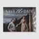 A modern save the date magnet designed to accommodate your favourite horizontal or landscape orientated full-bleed engagement photo. "Save the date" appears near the top of your photo in white block and script lettering, with your names, wedding date and wedding location beneath. Use the additional line of text to share your wedding website or additional details.