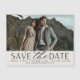 A modern save the date magnet designed to accommodate a single horizontal or landscape orientated engagement photo. "Save the date" appears beneath in chic block and script lettering, with your names, wedding date and wedding location beneath, along with your wedding website or additional details.