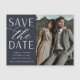 A modern save the date magnet designed to accommodate your favorite vertical or portrait oriented engagement photo. "Save the date" appears alongside your photo in chic block and script lettering, with your names, wedding date and wedding location beneath.