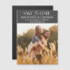 A modern save the date in a unique magnetic card format designed to accommodate your favourite engagement photo. "Save the date" appears at the top of your photo in white block and script lettering, with your names, wedding date and wedding location underneath on a grey background. Use the additional line of text to share your wedding website or additional details.