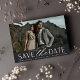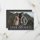 A modern save the date card designed to accommodate your favourite horizontal or landscape orientated full-bleed engagement photo. "Save the date" appears beneath your photo in chic block and script lettering, along with your names, wedding date and wedding location. Cards reverse to reveal additional save the date details.