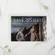 A modern save the date card designed to accommodate your favourite horizontal or landscape orientated full-bleed engagement photo. "Save the date" appears at the top of your photo in white block and script lettering, with your names, wedding date and wedding location beneath. Cards reverse to show additional save the date details.