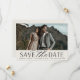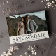 A modern save the date card designed to accommodate your favourite horizontal or landscape orientated full-bleed engagement photo. "Save the date" appears beneath your photo in chic block and script lettering, along with your names, wedding date and wedding location. Cards reverse to reveal additional save the date details.
