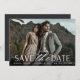 A modern save the date card designed to accommodate your favourite horizontal or landscape orientated full-bleed engagement photo. "Save the date" appears near the bottom of your photo in white block and script lettering, with your names, wedding date and wedding location beneath. Postcards reverse to show additional save the date details.