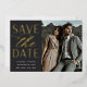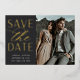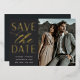 A modern save the date card designed to accommodate your favorite vertical engagement photo. "Save the date" appears alongside your photo in gold foil block and script lettering, with your names, wedding date and wedding location beneath. Personalize the back with additional details, such as your wedding website.