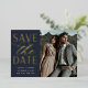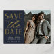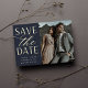 A modern save the date card designed to accommodate your favourite vertical engagement photo. "Save the date" appears alongside your photo in gold foil block and script lettering, with your names, wedding date and wedding location beneath. Personalise the back with additional details, such as your wedding website.