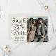 A modern save the date card designed to accommodate your favourite vertical engagement photo. "Save the date" appears alongside your photo in white block and script lettering, with your names, wedding date and wedding location beneath. Postcards reverse to reveal additional save the date details.
