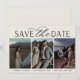 A modern save the date card designed to accommodate three vertical engagement photos aligned in a side by side layout. "Save the date" appears beneath in chic block and script lettering, along with your names, wedding date and wedding location. Cards reverse to reveal additional save the date details.